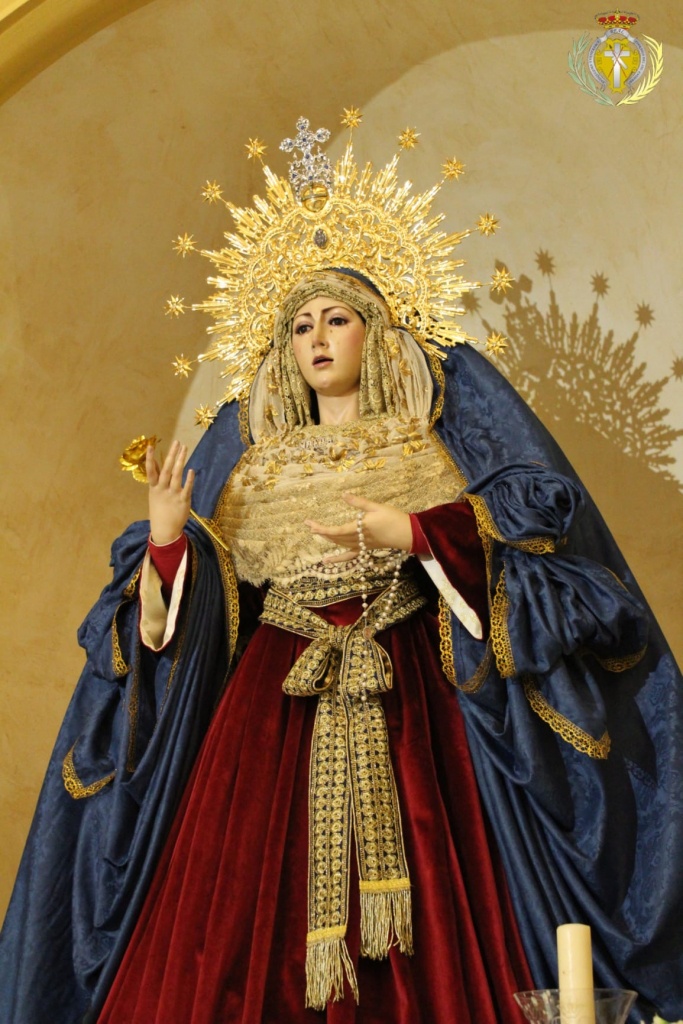 Nuestra Madre de La Soledad amanece ataviada para la inminente llegada del adviento con los colores Inmaculistas. Luce tocado en guipur dorado alternado con antiguo tul bordado en hojilla de oro entrefino. También viste una túnica en terciopelo de seda en color guinda y le cubre un manto azul de damasco. Tocada con diadema sobredorada …